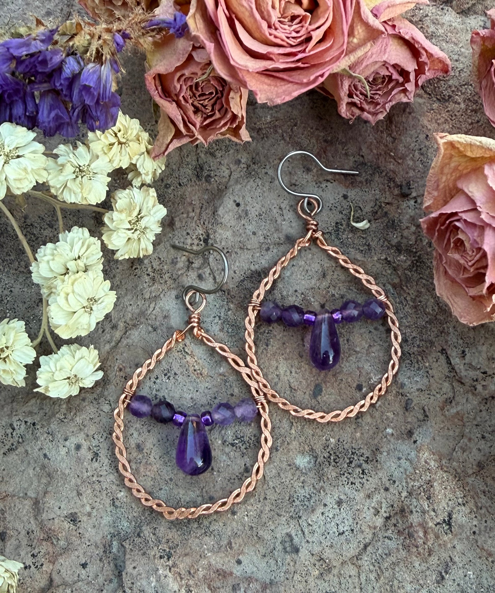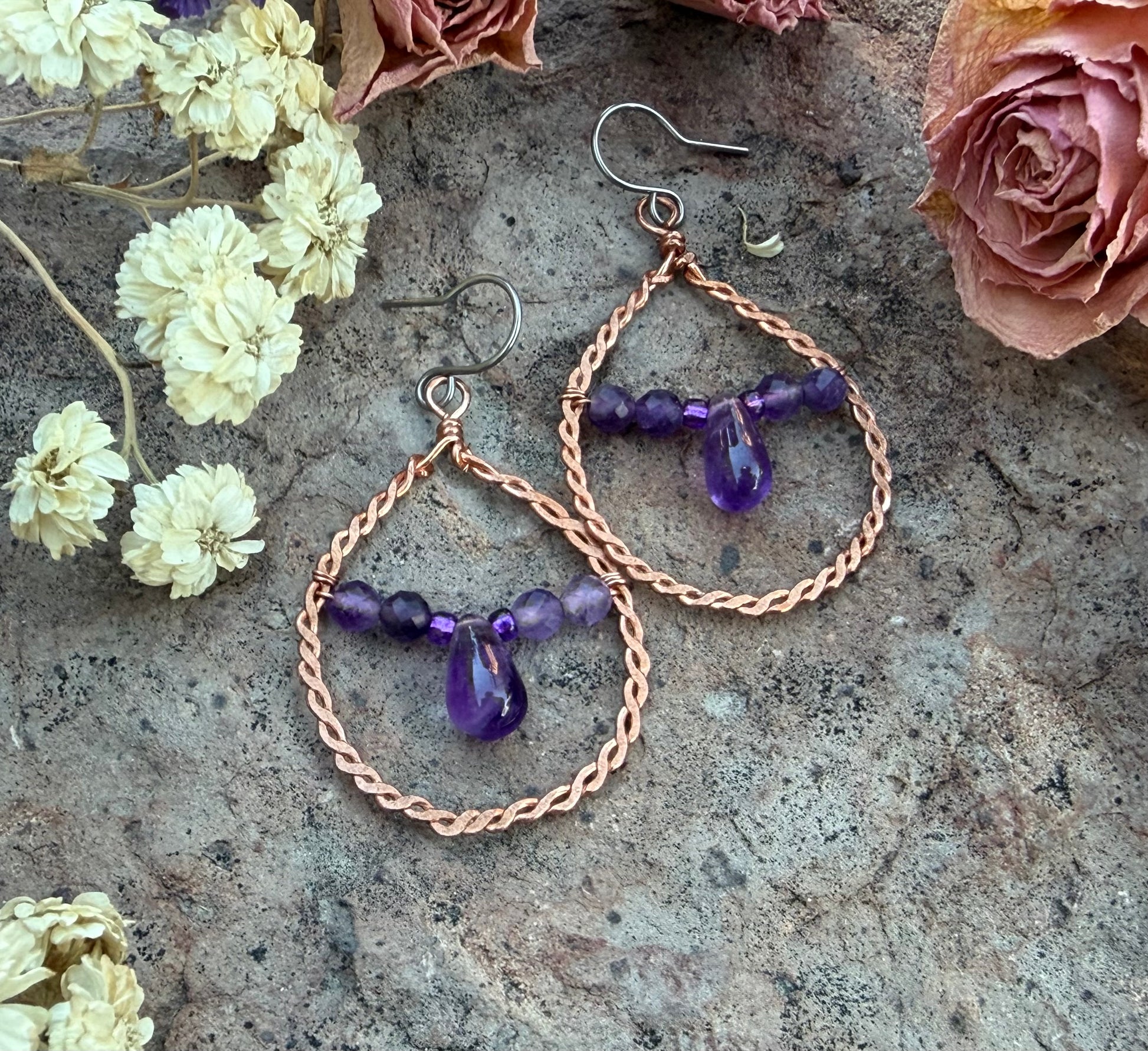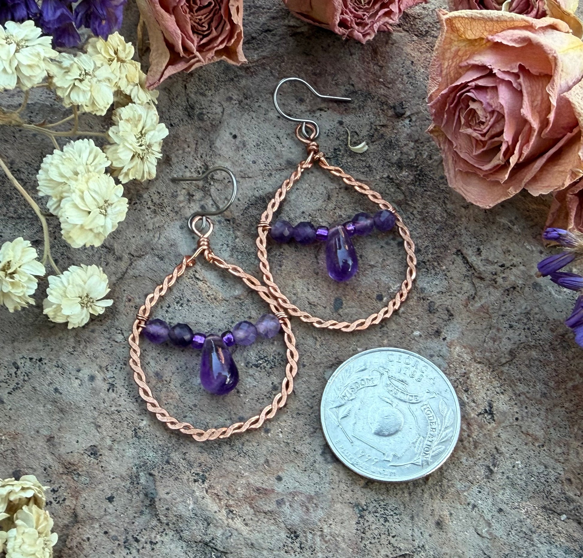 These twisted copper wire earrings with deep purple amethyst stones can give richness to any outfit. They measure approximately 2 inches, ear wires are niobium, a hypoallergenic metal. (Colors may vary due to different screens)