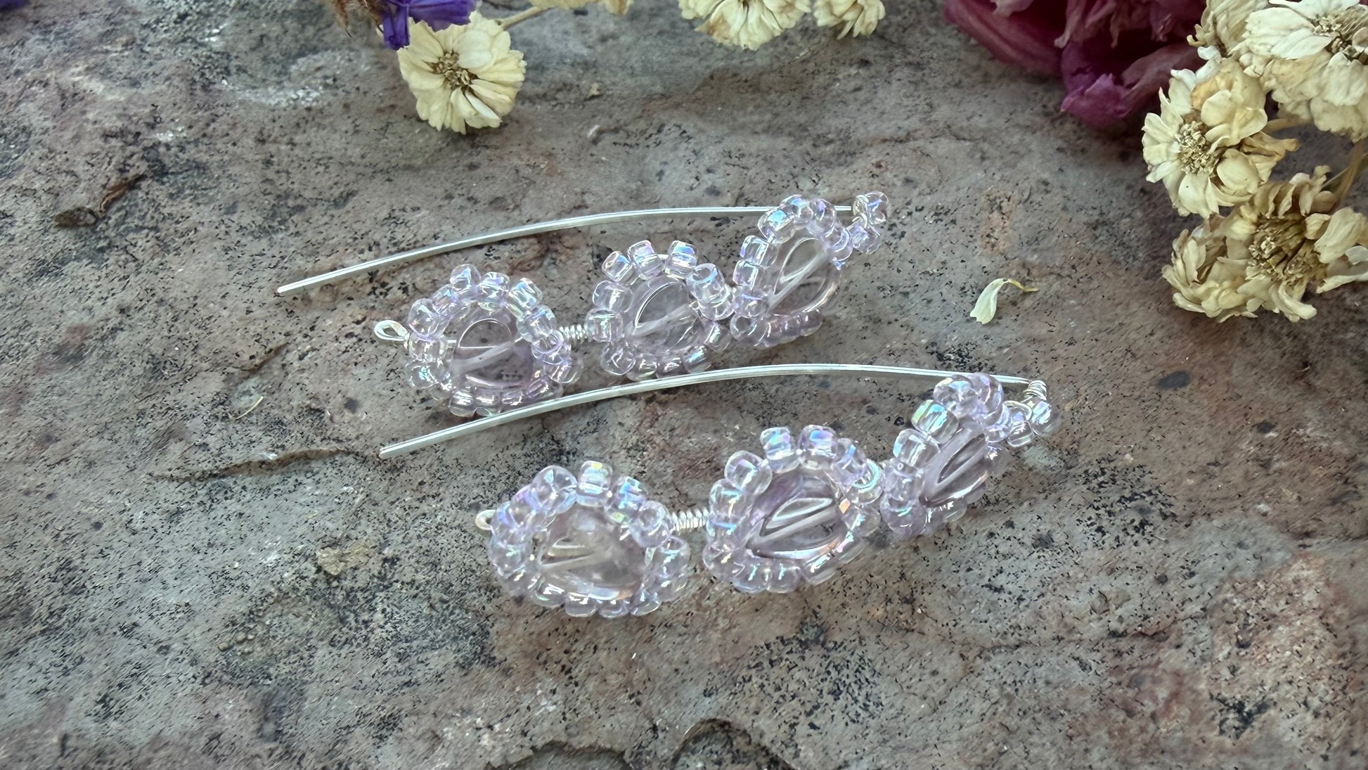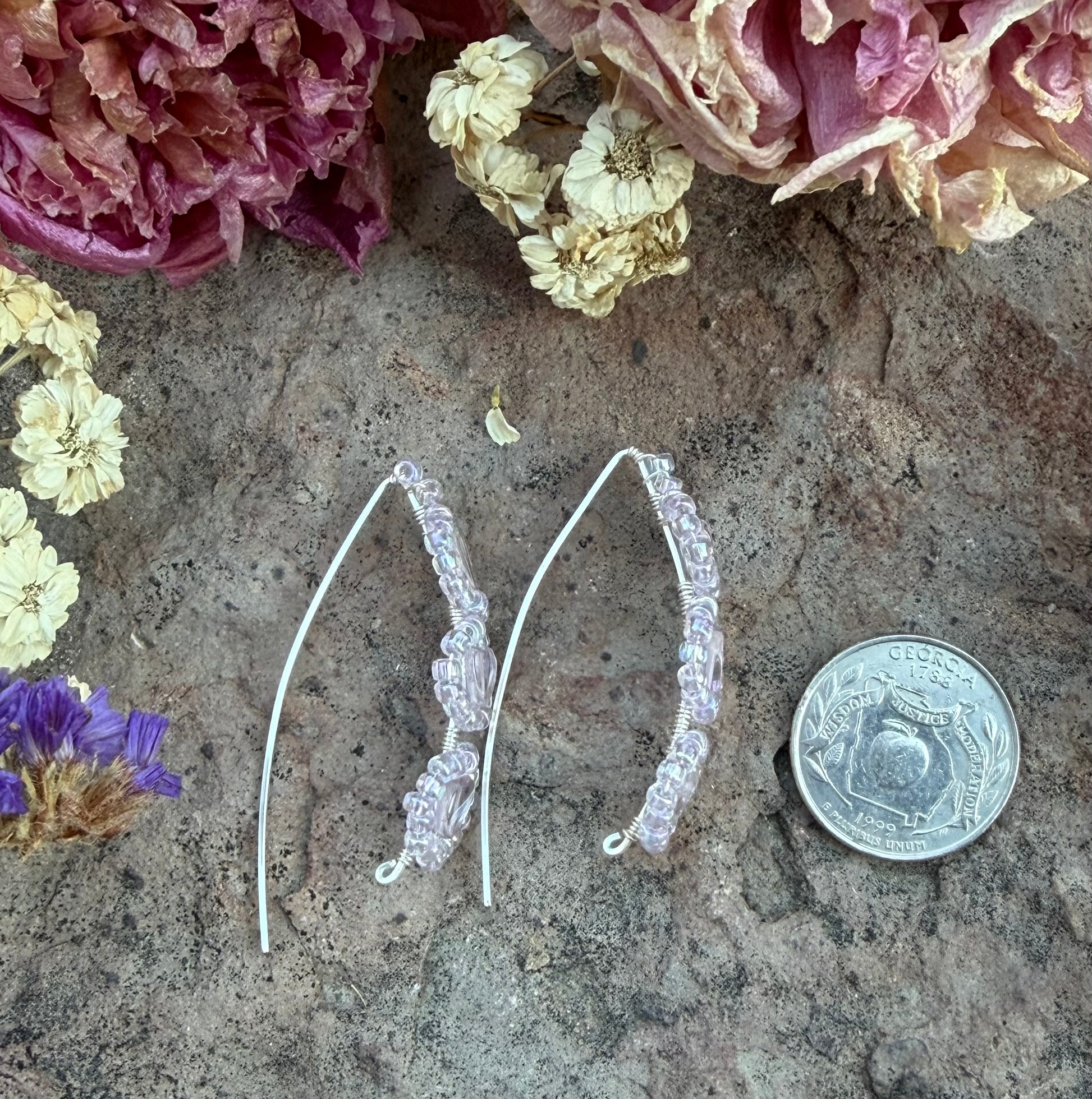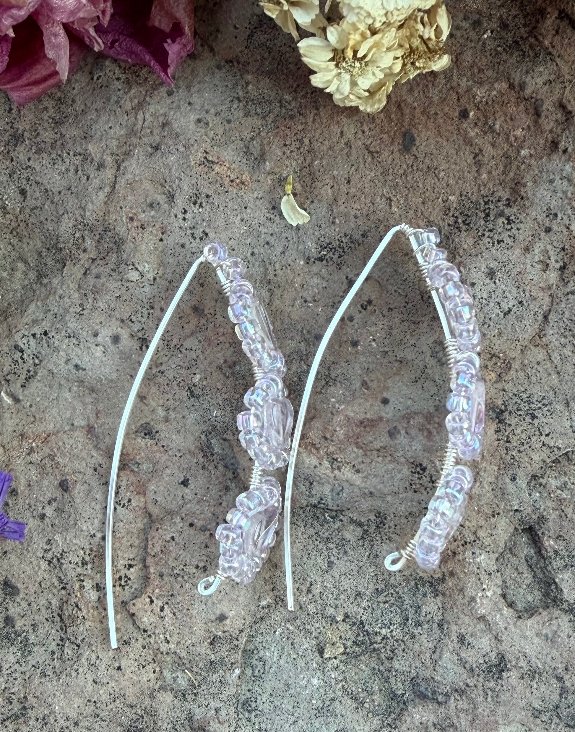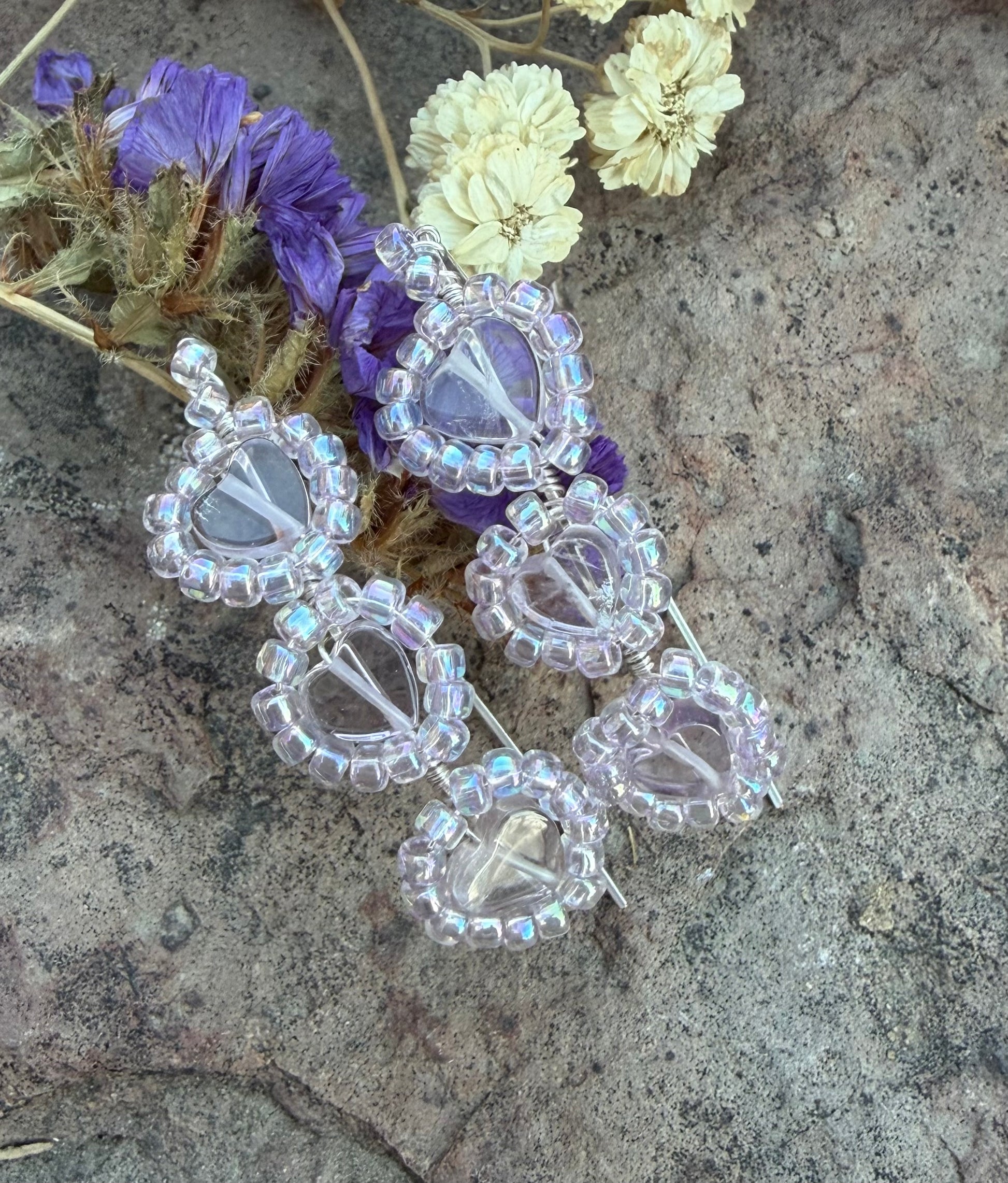 Silver plated copper wire earrings with pale heart shaped amethyst beads with glass seed beads. These earrings will add a delicate and elegant touch to any outfit for a special occasion. They measure approximately 1 3/4 inch. (Colors may vary due to different screens)