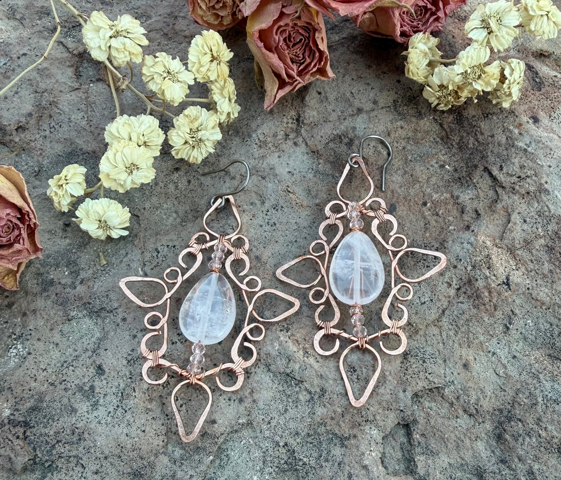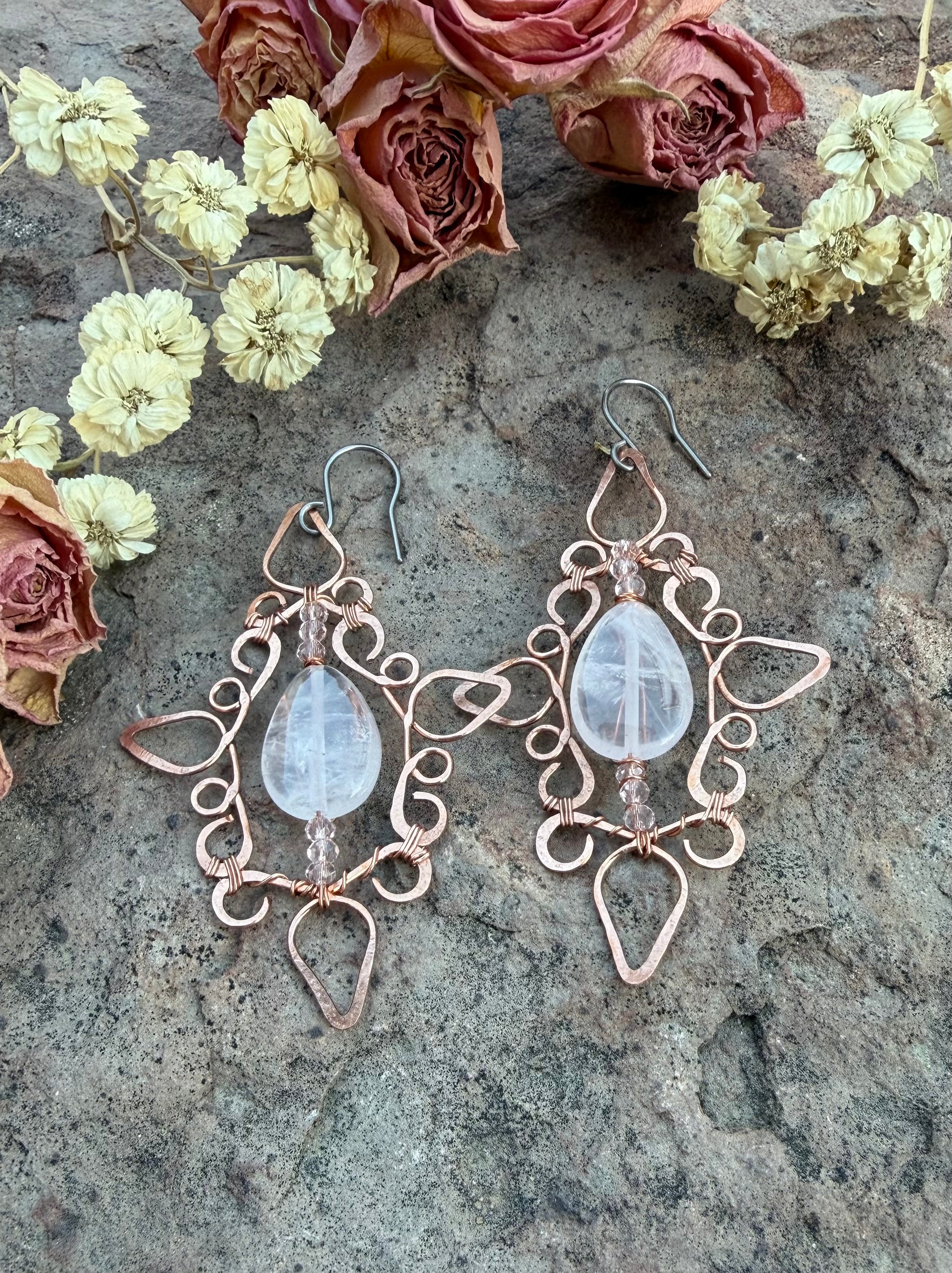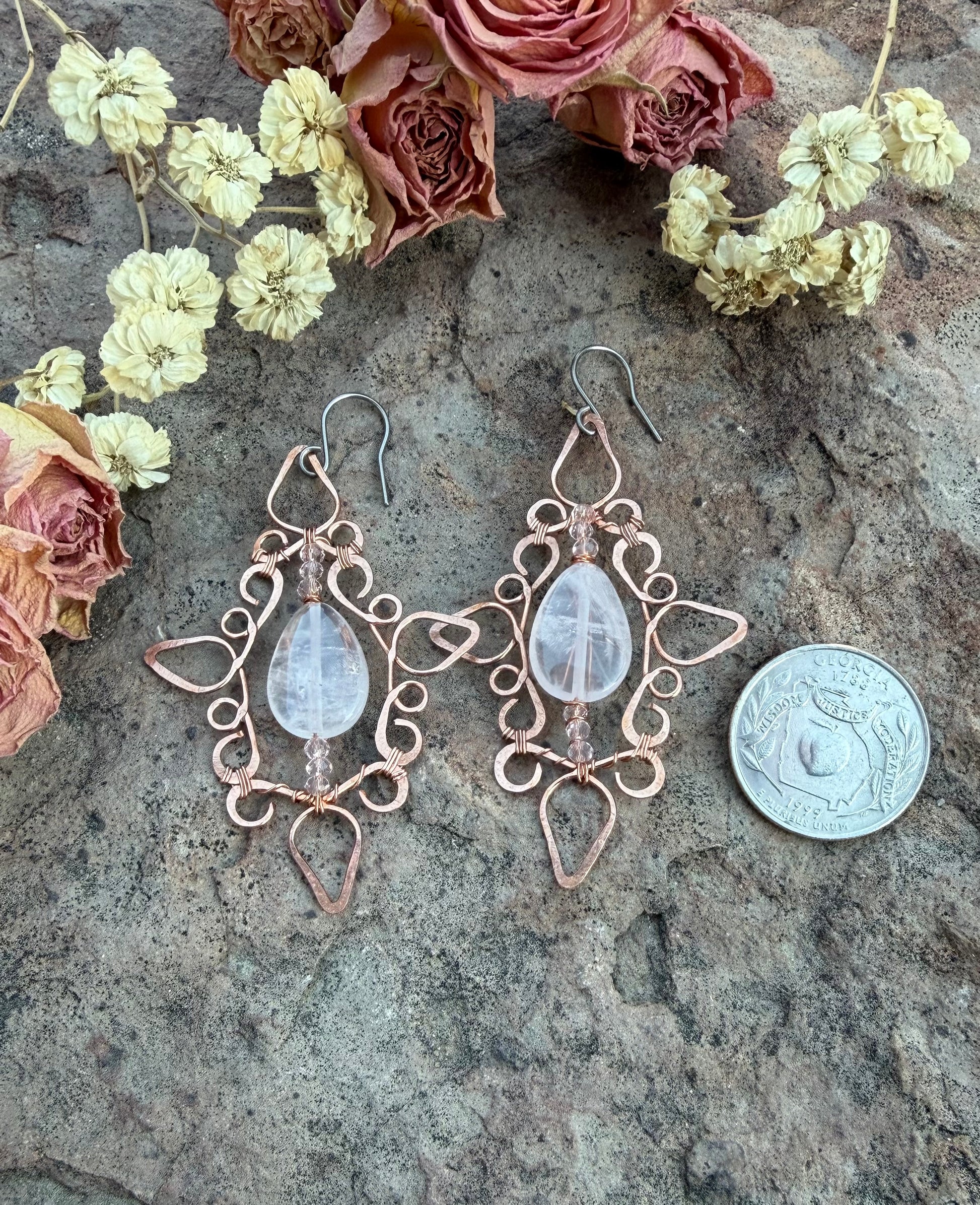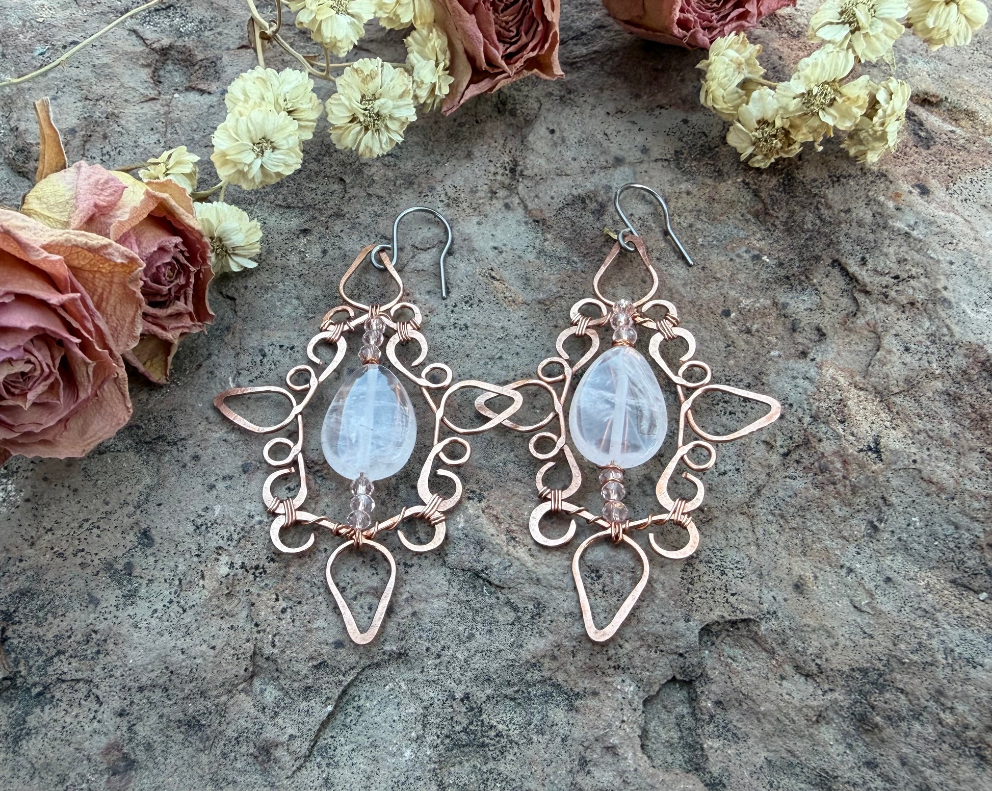 These copper wire earrings complimented with rose quartz and pink glass can be worn for casual or special occasions. They are approximately 2 7/8 inches in length. (Ear wire is made of niobium a hypoallergenic metal.) (Colors may vary due to different screens.)